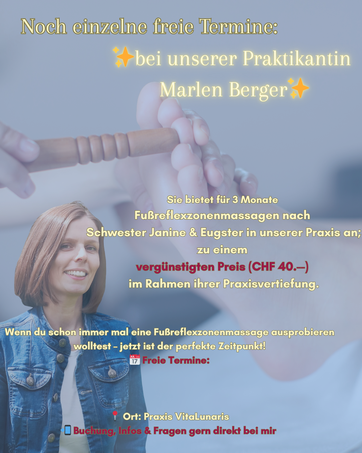 Ab September wird Marlen Berger bei uns als Praktikantin ihre wunderbare Fussreflexmassage, im Rahmen ihrer Praxisvertiefung anbieten.